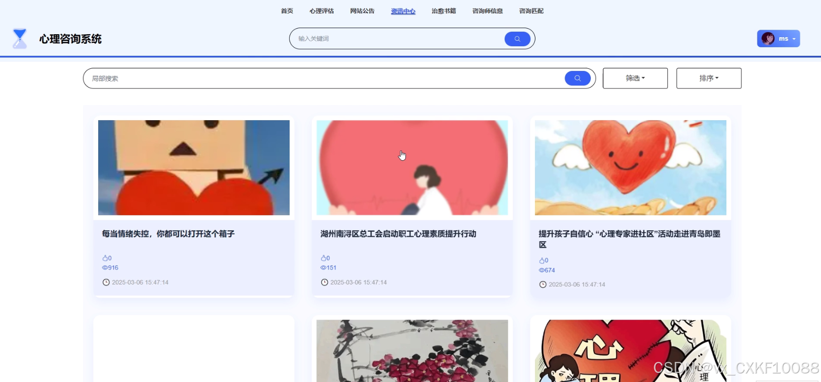 咨询记录:用户可以通过查询和重置功能轻松找到特定的咨询记录,并查看具体详情,如咨询师信息、咨询时长、心理状态等,便于回顾和反思。心理报告:用户能够访问生成的心理报告,获取专业的心理健康评估结果和建议,有助于自我理解和成长。咨询匹配:系统根据用户的咨询问题和个人偏好自动匹配合适的咨询师,用户可以查看匹配详情并调整自己的需求,提高咨询服务的精准度和满意度。分配咨询师:除了自动匹配外,用户还可以手动查询和查看由管理员分配的咨询师详情,确保每一步都能获得专业的指导和支持。收藏:允许用户将感兴趣的书籍、文章或咨询师添加到收藏夹,方便随时回顾和参考,增强个性化体验。评论管理:用户可以在个人中心集中管理自己对书籍、文章或咨询师发表的评论,便于随时修改观点或删除不再适用的评论内容,促进社区内的积极互动。