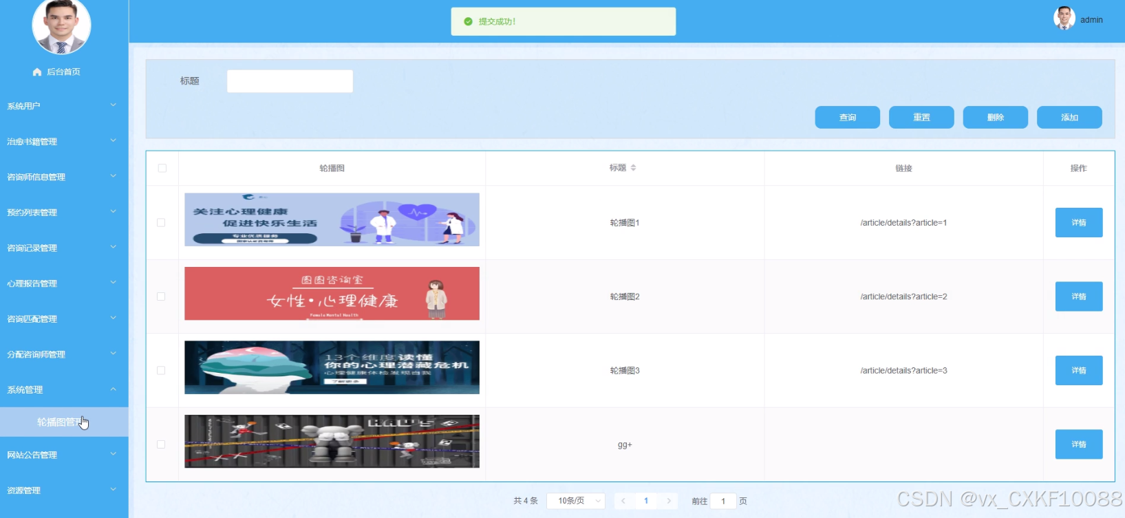 系统管理:轮播图管理,支持轮播图的查询、重置、删除及添加功能,增强网站的视觉吸引力和用户体验,提升品牌形象。