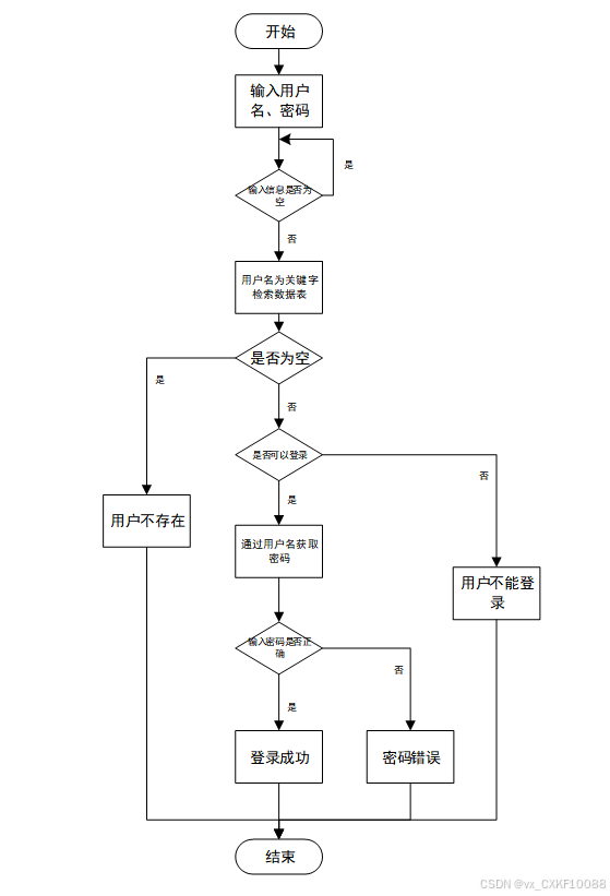 用户输入用户名和密码后,系统先检查输入是否为空,再验证用户名是否存在,若存在则通过用户名获取密码并校验。若密码正确则登录成功,否则提示密码错误。若用户名不存在或无法登录,提示用户操作无效。如下图所示。