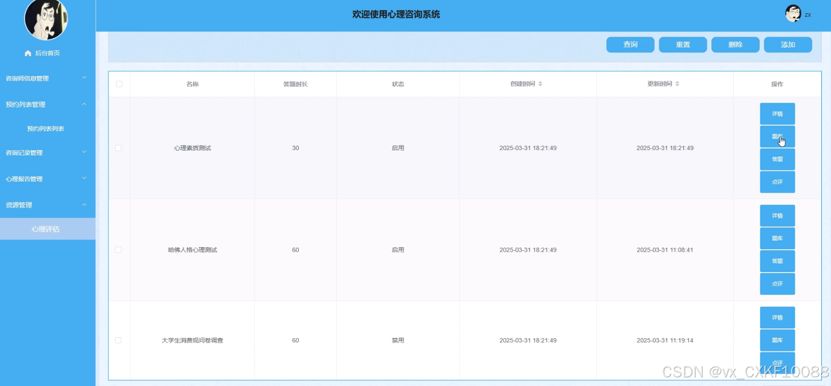 资源管理:心理评估,提供详尽的心理评估工具,支持题库管理(查询、重置、删除、添加新题目类型、题目、选项及排序),并具备导出、导入和下载导入文档的功能,确保评估工具的有效性和灵活性。答题与点评,支持在线答题及提交后的专业点评反馈,促进用户的自我认知和个人成长,增强咨询服务的效果。