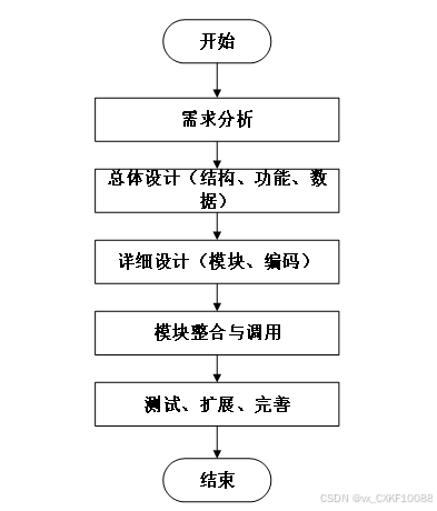 系统开发流程的主要步骤,从需求分析到系统完成的全过程。流程包括需求分析、总体设计(结构、功能、数据)、详细设计(模块、编码)、模块整合与调用,以及测试、扩展和完善,最终完成系统的开发。本系统的开发流程如下图所示