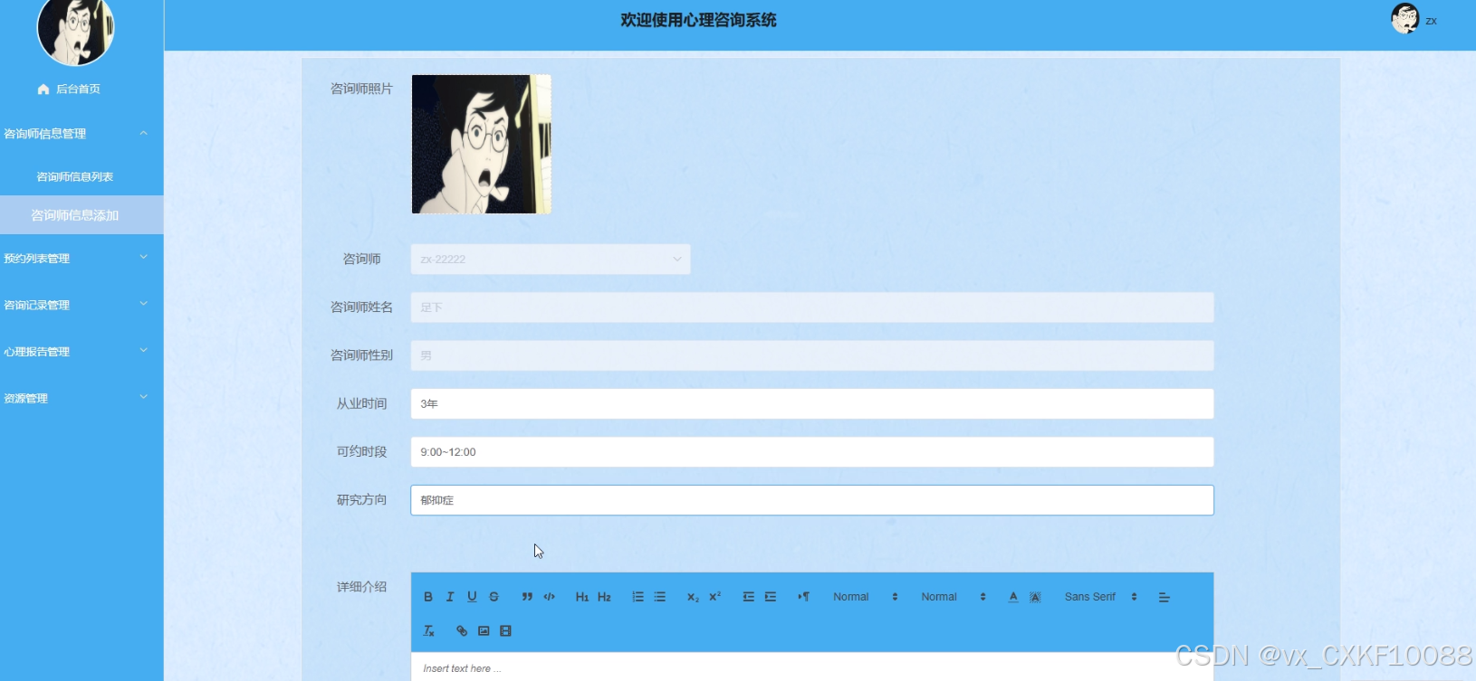 咨询师信息管理:咨询师信息列表查看咨询师个人的信息,支持查看详情(包括评论),支持更新咨询师信息,要求填写详细的个人资料如照片、姓名、性别、从业时间、可约时段、研究方向及详细介绍,确保咨询师的专业背景清晰呈现且信息更新及时准确。