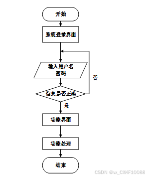 用户首先进入系统登录界面,输入用户名和密码后,系统验证信息是否正确。若验证失败,返回登录界面重新输入,若验证成功,则进入功能界面,执行相应功能处理后结束操作流程。操作流程如下图所示。