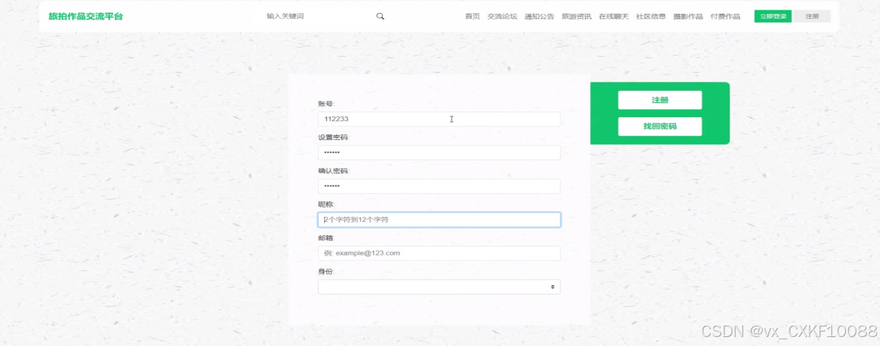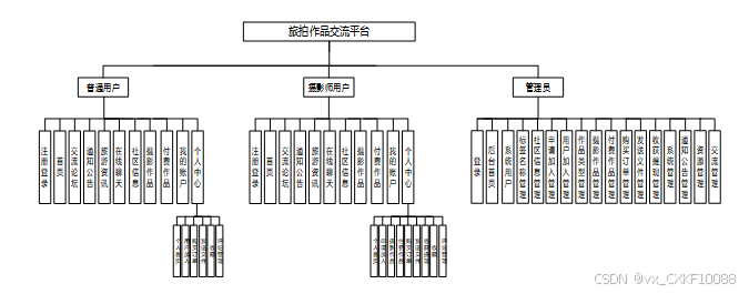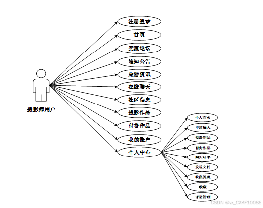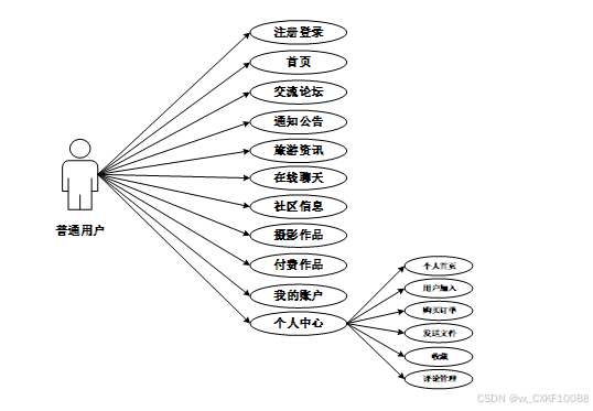 普通用户可注册登录进系统界面,系统界面由注册登录、首页、交流论坛、通知公告、旅游资讯、在线聊天、社区信息、摄影作品、付费作品、我的账户和个人中心(个人首页、用户加入、购买订单、发送文件、收藏、评论管理)组成,以满足用户在旅拍作品中的各种需求。具体的功能如下: