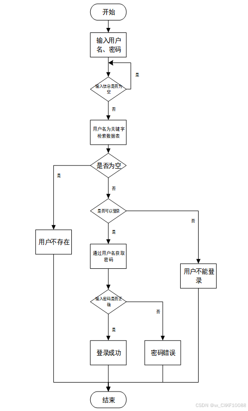 用户输入注册用户名和密码后,系统先检查输入是否为空,再验证注册用户名是否存在,若存在则通过注册用户名获取密码并校验。若密码正确则登录成功,否则提示密码错误。若注册用户名不存在或无法登录,提示注册用户操作无效。如图所示。