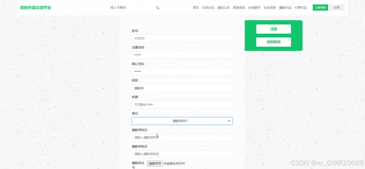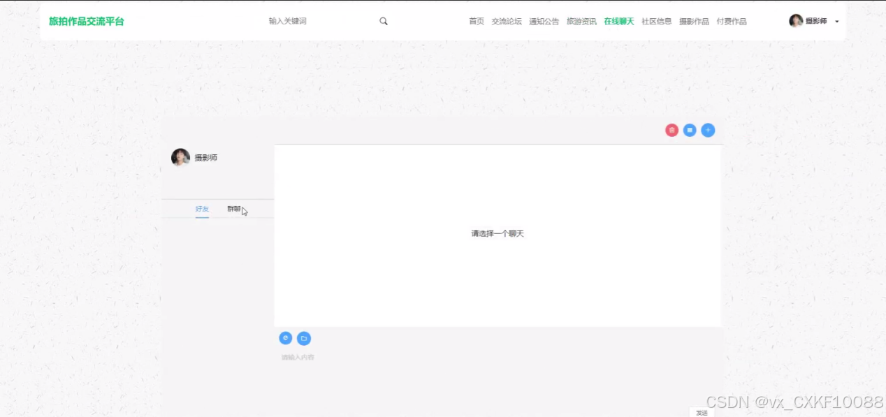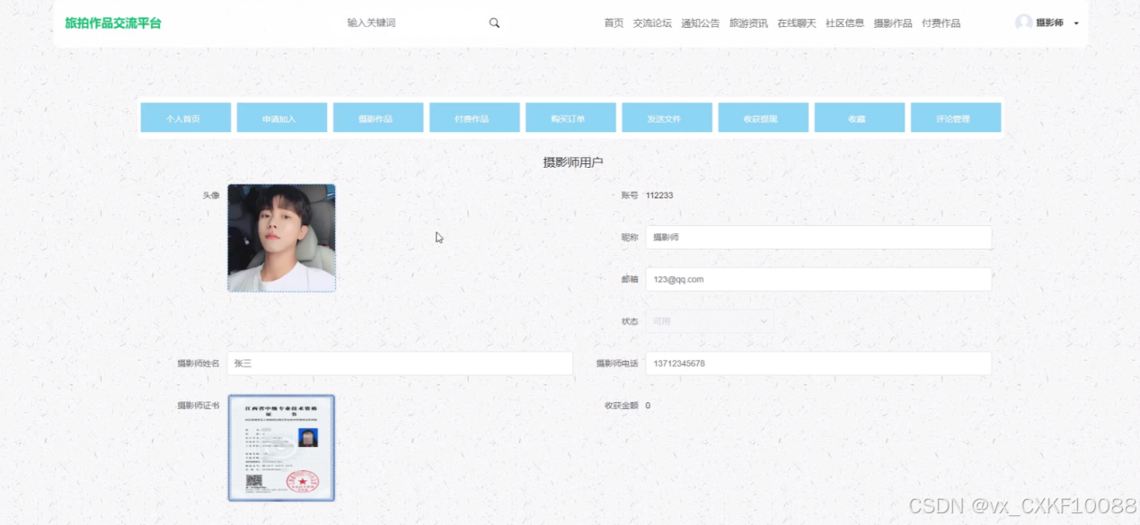 摄影师用户可注册登录进系统界面,系统界面由注册登录、首页、交流论坛、通知公告、旅游资讯、在线聊天、社区信息、摄影作品、付费作品、我的账户和个人中心(个人首页、申请加入、摄影作品、付费作品、购买订单、发送文件、收获提现、收藏、评论管理)组成,为摄影师用户提供一个既专业又充满活力的旅拍作品交流平台。具体的功能如下: