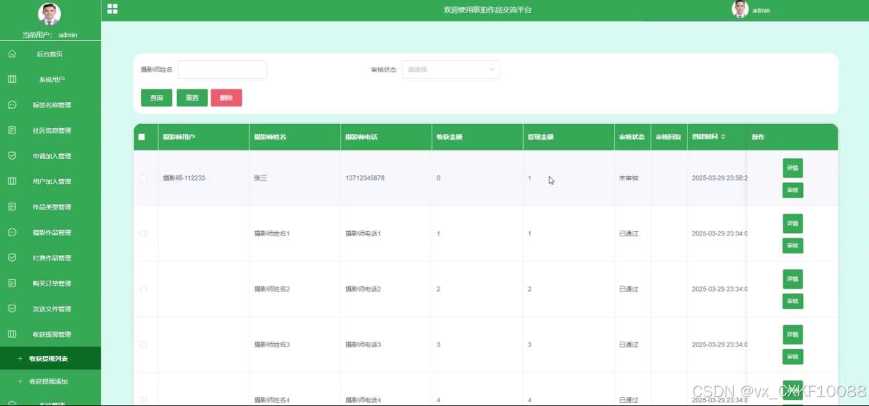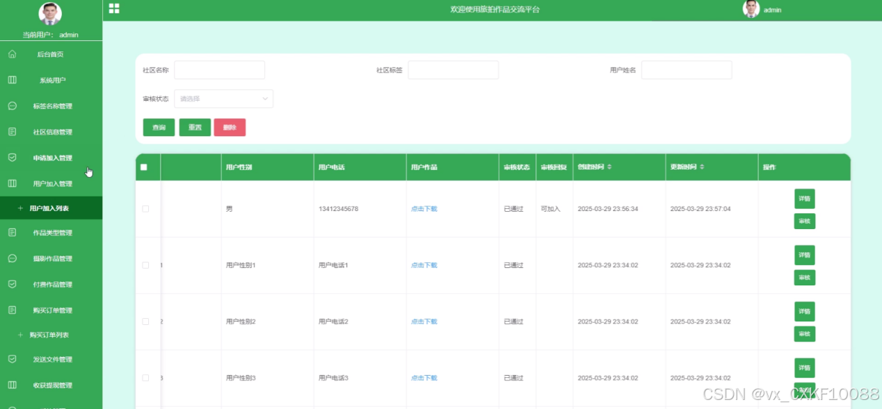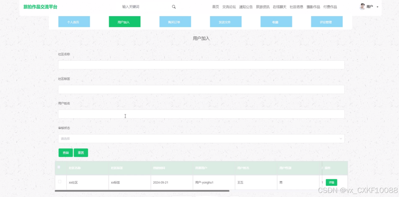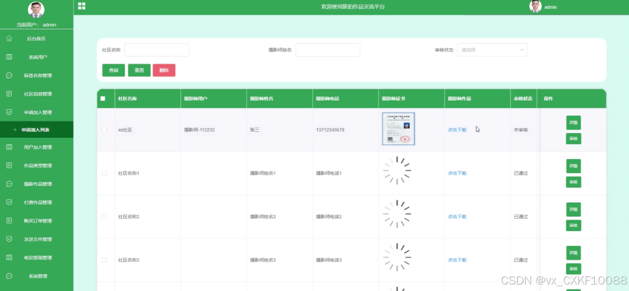 申请加入管理:管理员查看摄影师用户提交的社团加入申请列表,审查每一个申请的详情,并决定是否批准加入请求。这有助于确保社区成员的质量,维持一个积极健康的交流环境。