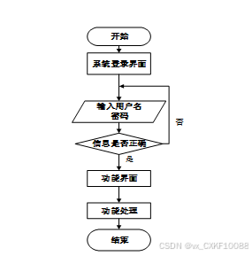 用户首先进入系统登录界面,输入注册用户名和密码后,系统验证信息是否正确。若验证失败,返回登录界面重新输入;若验证成功,则进入功能界面,执行相应功能处理后结束操作流程。操作流程如图所示。