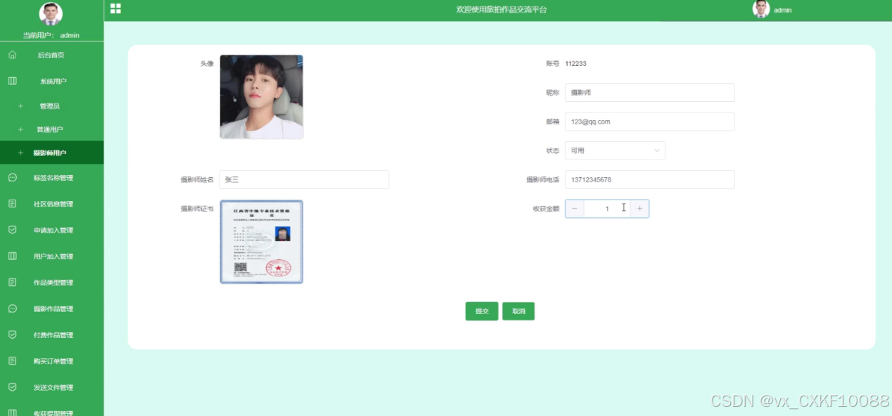 系统用户:管理员全面管理平台上的所有用户,涵盖管理员、普通用户以及摄影师用户。特别地,对于摄影师用户的提现申请,管理员可以审核后直接支付款项,并根据需要调整各用户的使用状态与权限,确保平台运营的顺畅。