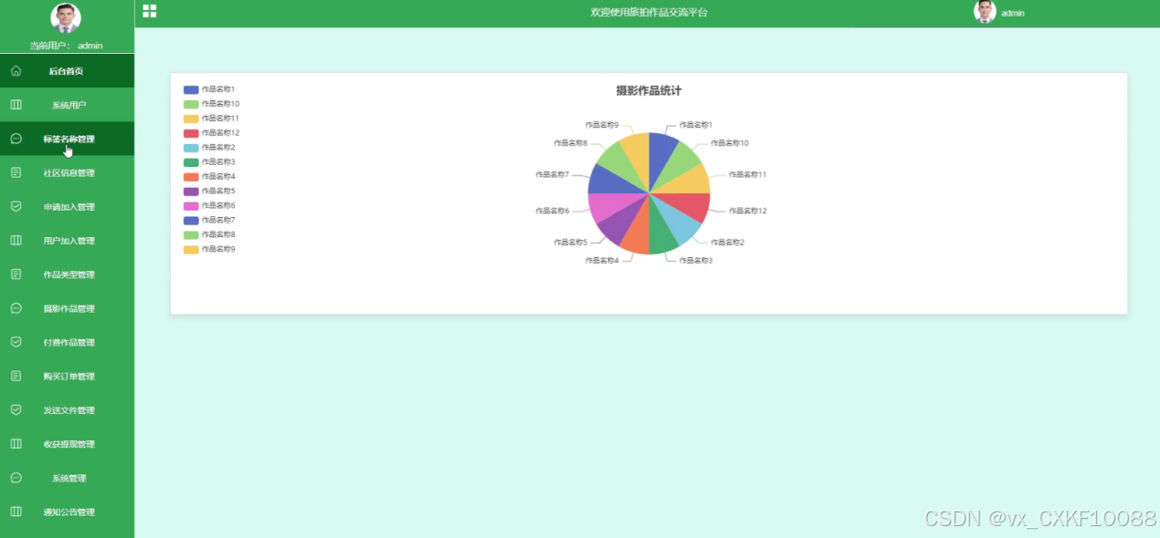 后台首页:为管理员提供了摄影作品的详细统计概览,包括上传数量、分类分布等关键数据。这些信息有助于管理员快速了解平台上内容的整体状况,做出更加精准的数据驱动决策。