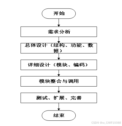 系统开发流程的主要步骤,从需求分析到系统完成的全过程。流程包括需求分析、总体设计(结构、功能、数据)、详细设计(模块、编码)、模块整合与调用,以及测试、扩展和完善,最终完成系统的开发。本系统的开发流程如图所示