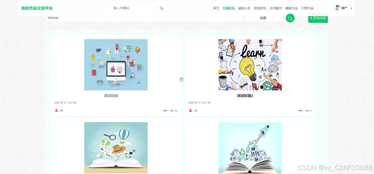 | 查看 旅拍作品交流平台信息测试 | 登录系统 进入 旅拍作品交流平台信息页面 使用搜索栏输入关键词搜索 旅拍作品交流平台信息 | 无 | 符合预期 |