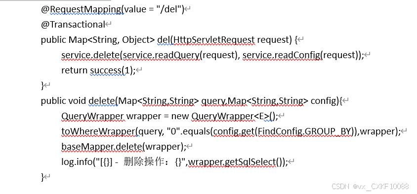 删除一条数据,通过readQuery(),获取URL后面的对象地址,删除FROM具体的table,query删除查询FindConfig语句,代码如图示。