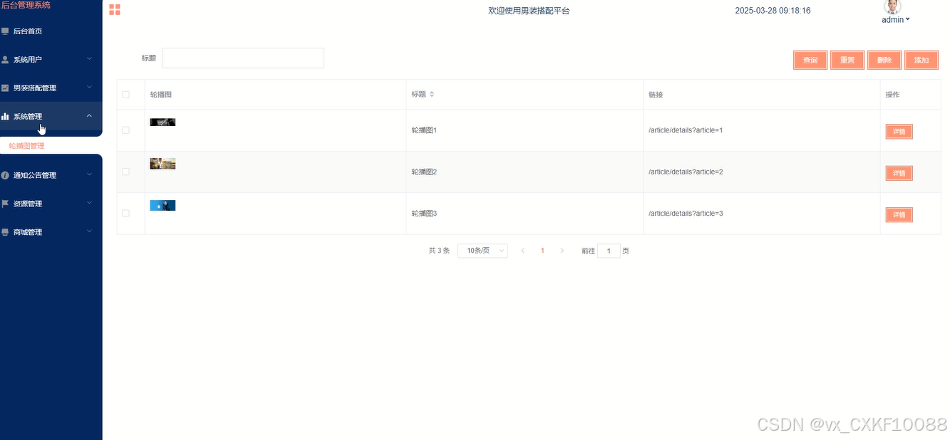 5.系统管理:管理员可以管理平台的轮播图,设置显示的图片和链接,提升首页的视觉效果和用户体验。