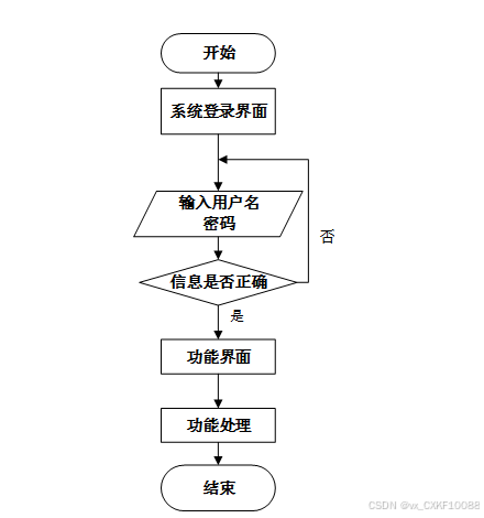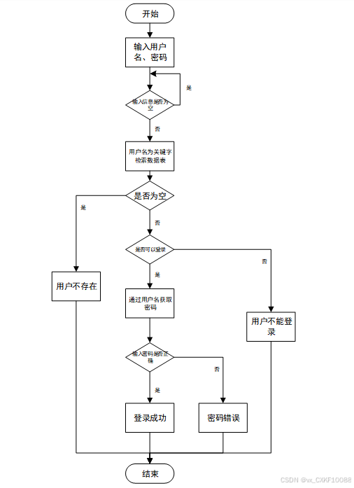 用户输入用户名和密码后,系统先检查输入是否为空,再验证用户名是否存在,若存在则通过用户名获取密码并校验。若密码正确则登录成功,否则提示密码错误。若用户名不存在或无法登录,提示用户操作无效。如下图所示。