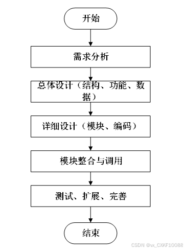 系统开发流程的主要步骤,从需求分析到系统完成的全过程。流程包括需求分析、总体设计(结构、功能、数据)、详细设计(模块、编码)、模块整合与调用,以及测试、扩展和完善,最终完成系统的开发。本系统的开发流程如下图所示