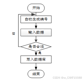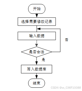用户首先选择需要修改的记录,输入修改后的数据,系统判断输入数据是否合法。若数据不合法,提示重新输入;若数据合法,则将修改后的数据写入数据库,完成操作后流程结束。修改信息流程图如图3-8所示。