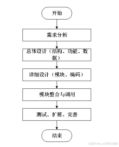 系统开发流程的主要步骤,从需求分析到系统完成的全过程。流程包括需求分析、总体设计(结构、功能、数据)、详细设计(模块、编码)、模块整合与调用,以及测试、扩展和完善,最终完成系统的开发。本系统的开发流程如图3-4所示
