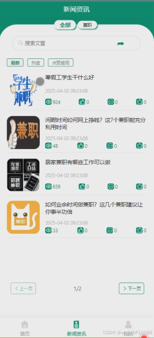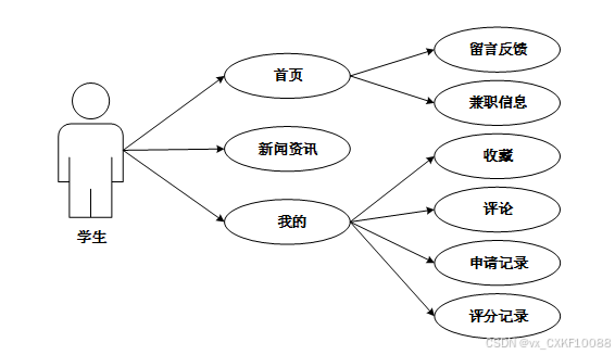 学生的功能有:首页(留言反馈、兼职信息)、新闻资讯、我的(收藏、评论、申请记录、评分记录)。