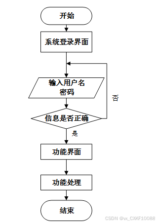 用户首先进入系统登录界面,输入用户名和密码后,系统验证信息是否正确。若验证失败,返回登录界面重新输入;若验证成功,则进入功能界面,执行相应功能处理后结束操作流程。操作流程如图3-6所示。