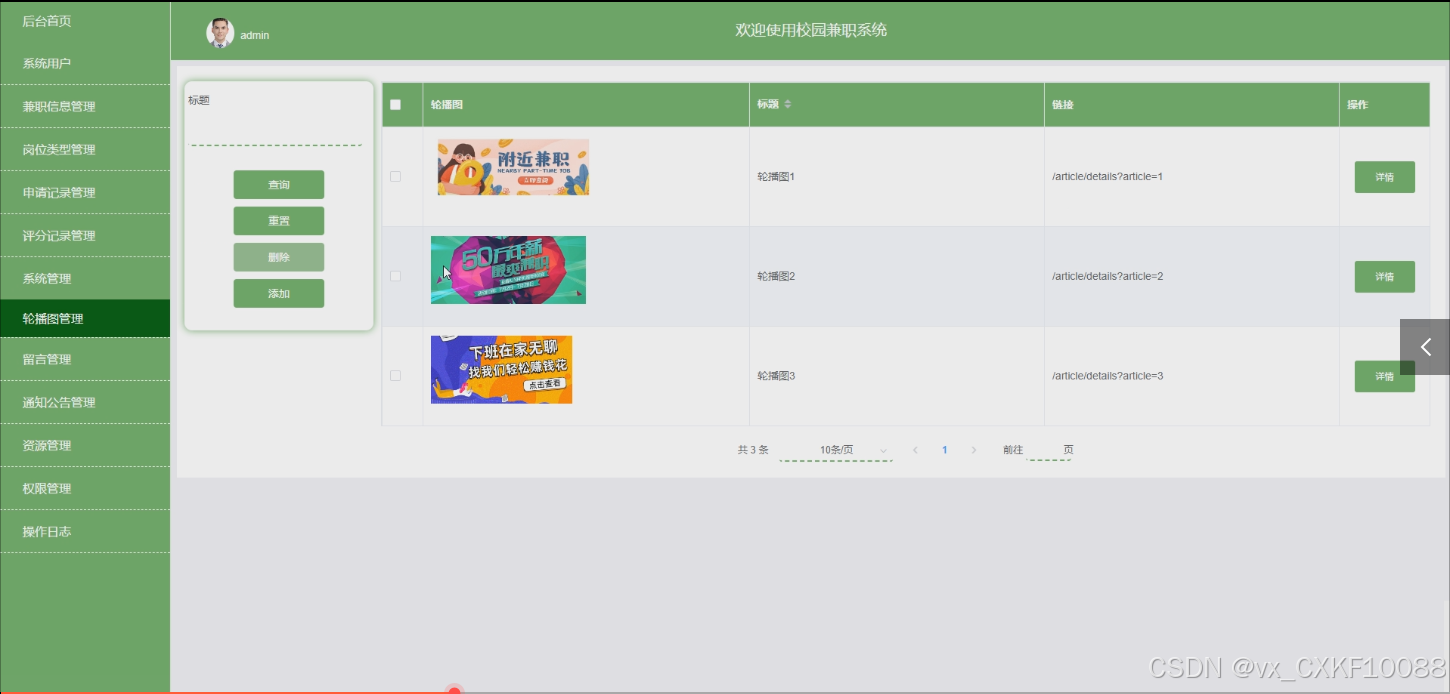 管理员进入系统管理页面,查看所有轮播图信息,添加新的轮播图。系统管理界面如图5-13所示。