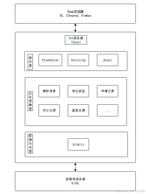 系统由表现层、业务逻辑层、数据访问层和数据库服务器组成。表现层通过浏览器(如IE、Chrome、Firefox)与用户交互,采用FreeMarker、Bootstrap、jQuery等技术实现界面呈现。业务逻辑层负责处理系统的核心业务逻辑,通过分模块设计实现功能分离。数据访问层使用MyBatis框架连接数据库,执行数据的增删改查操作。数据库服务器采用MySQL进行数据存储和管理,为系统提供稳定的数据库支持。整个架构通过Tomcat服务器完成用户请求的接收和处理,确保系统的高效运行[8]。整个系统架构如图4-1所示。