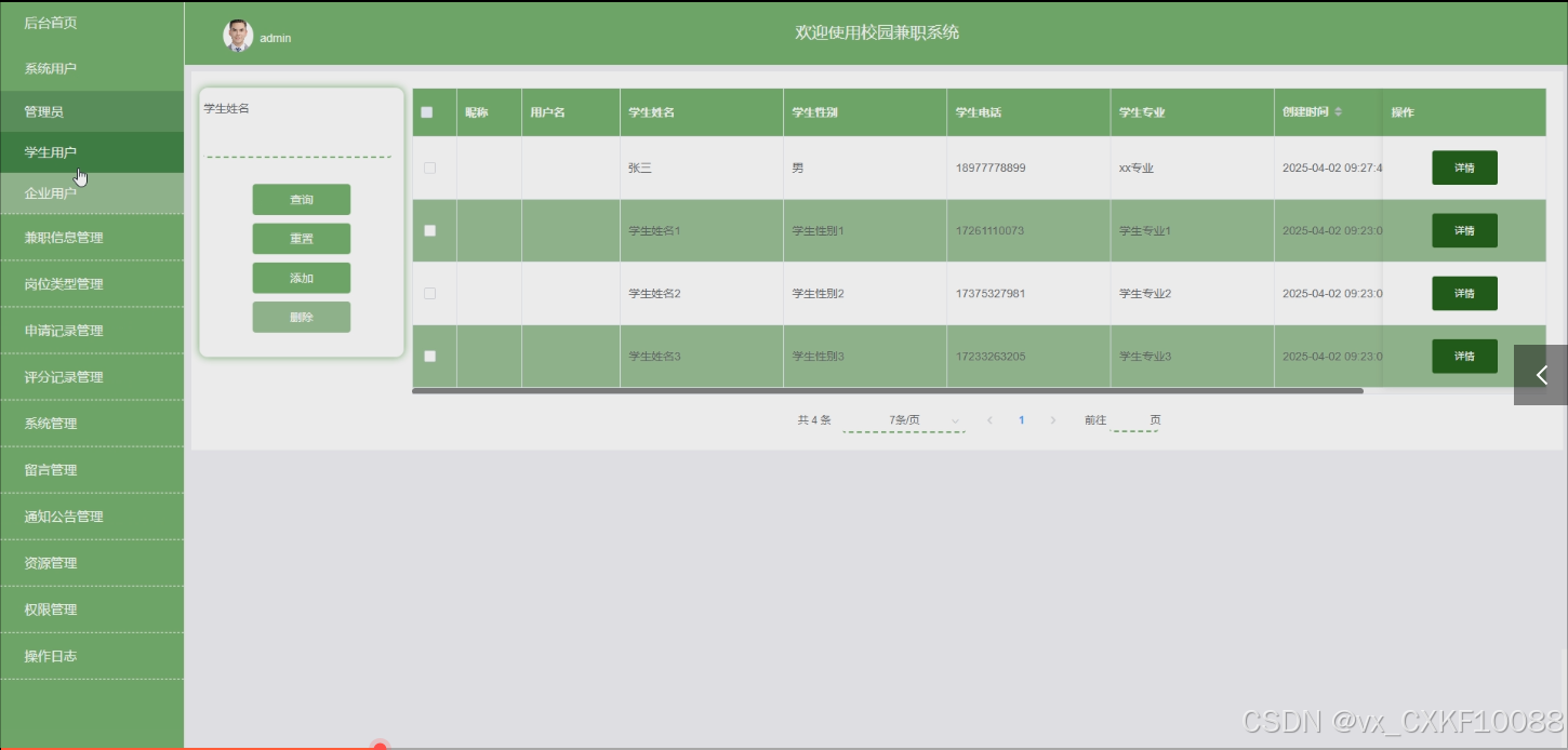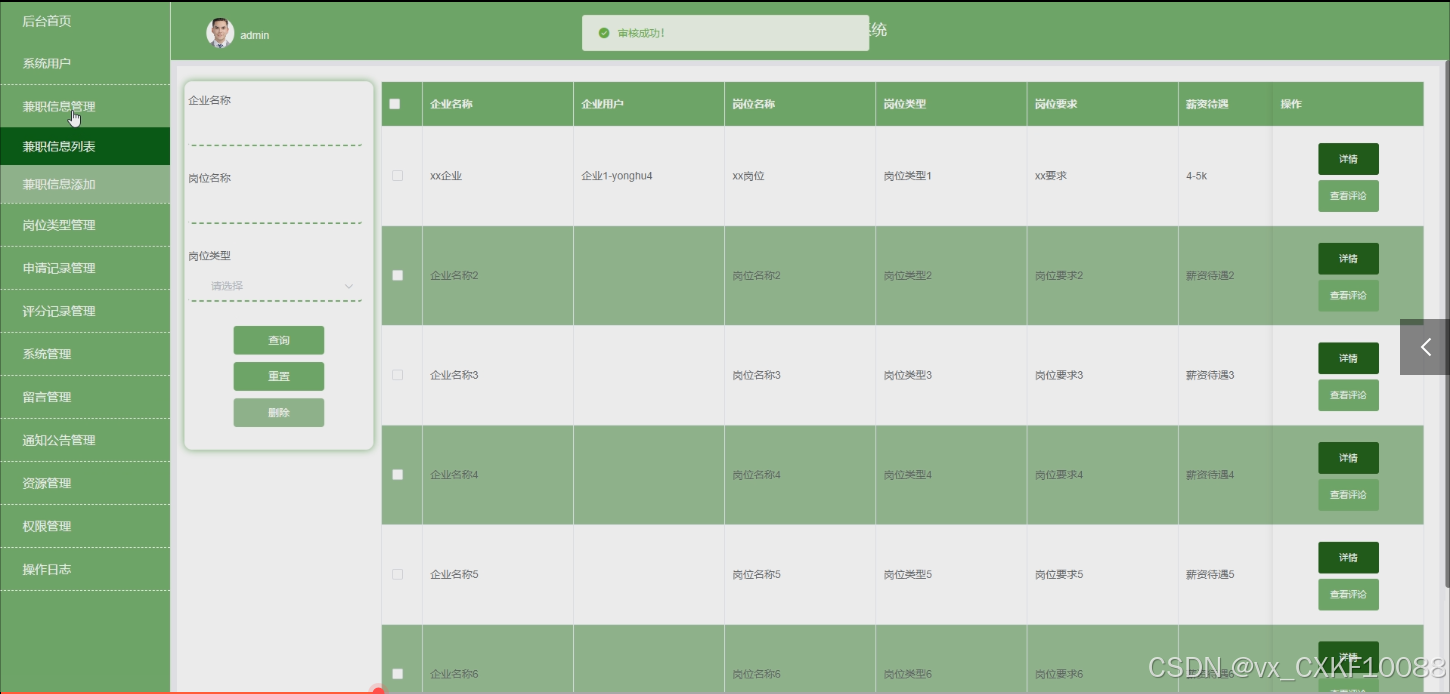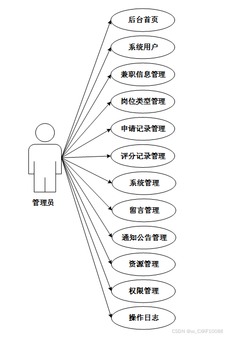 管理员的功能:系统用户、兼职信息管理、标签类型管理、地区分类管理、不良举报管理、系统管理、通知公告管理、资源管理、交流管理。