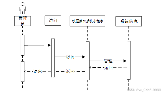 管理员通过访问系统发起请求,系统接收访问后转向系统信息模块进行管理操作。管理完成后,系统返回管理结果至系统,最终反馈给管理员,管理员可选择退出。管理员管理系统信息时序图如图4-6所示。