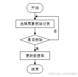 用户选择需要删除的记录后,系统判断是否确认删除。若未确认,返回选择环节;若确认删除,则更新数据库,删除对应记录,完成操作后流程结束。删除信息流程图如图3-9所示。