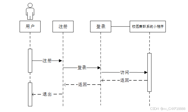 用户通过注册模块发送注册请求,系统完成注册后返回确认信息。随后,用户通过登录模块发送登录请求,系统验证用户信息后允许访问目标系统。用户完成操作后可选择退出,系统终止会话。注册时序图,如图4-3所示。
