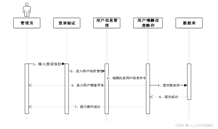 管理员输入登录信息后,进入用户信息管理模块,选择增删改查操作并提交命令至数据库。数据库执行操作后返回成功状态,系统显示用户管理界面并提示操作成功。管理员修改用户信息时序图如图4-5所示。