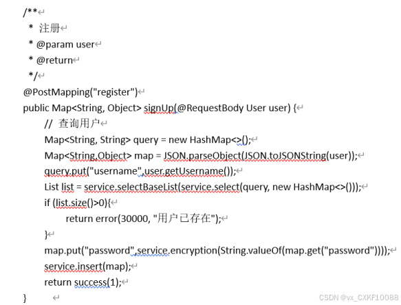 注册页UserController.java,传入user对象,并将"user_id"、 "state"、 "user_group"、"login_time"、"phone"、"phone_state"、 "username"、"nickname"、"password"、"email"、"email_state"、"avatar"、"create_time"输入,重点是 "username"、"nickname"、"password"必须输入,通过获取username,数据库查询是否有该用户,如果存在,则提示“用户已存在”,否则执行将UserId置为空(数据库表中该字段已设置自动递增),代码如图所示。