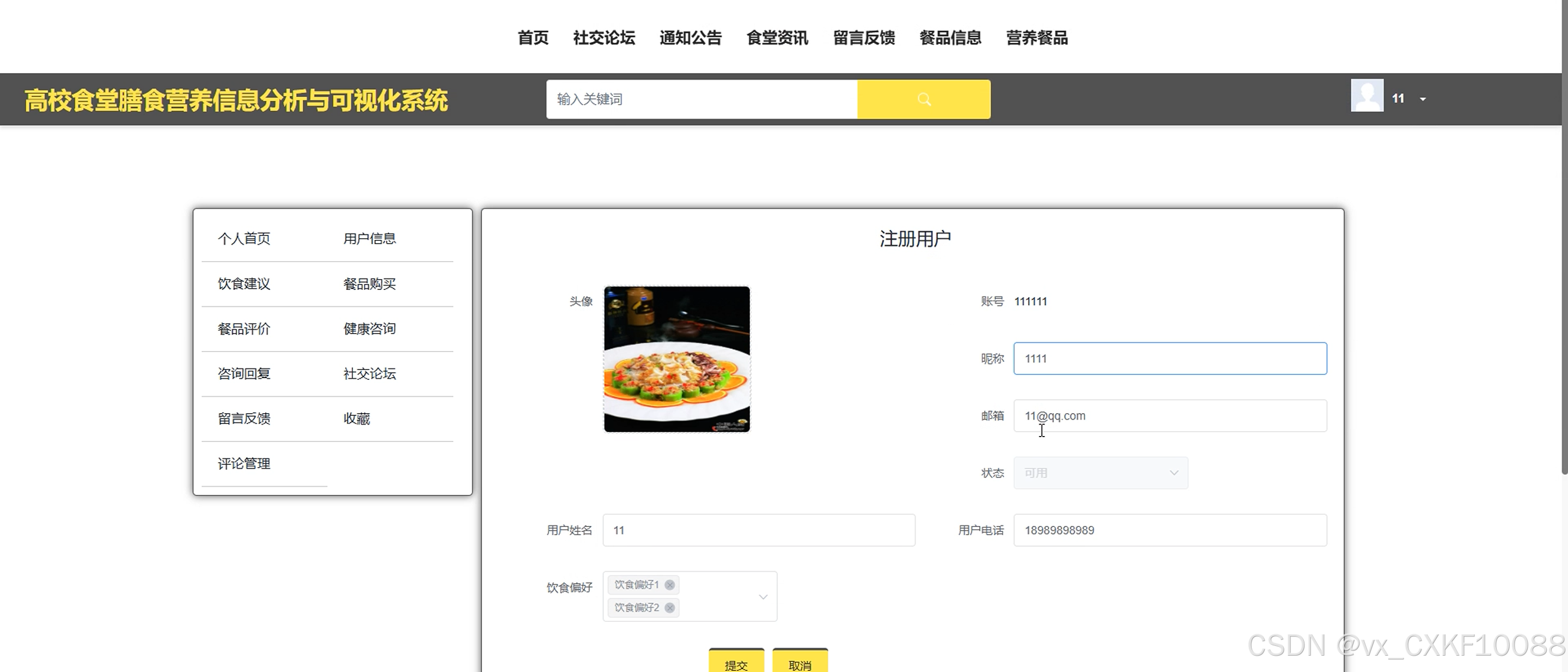 用户端功能丰富,支持餐品信息查询、个性化推荐及订单管理。师生可实时查询餐品的营养成分和价格,获取基于个人健康需求的饮食建议,并通过系统完成在线点餐等操作。管理员端则涵盖餐品信息管理、营养数据分析及系统配置等功能。食堂管理人员可轻松维护餐品信息,实时监控营养数据,优化餐品搭配,确保食堂运营的高效性和科学性。