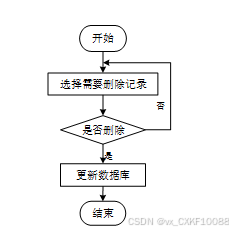 用户选择需要删除的记录后,系统判断是否确认删除。若未确认,返回选择环节;若确认删除,则更新数据库,删除对应记录,完成操作后流程结束。删除信息流程图如图4-5所示。