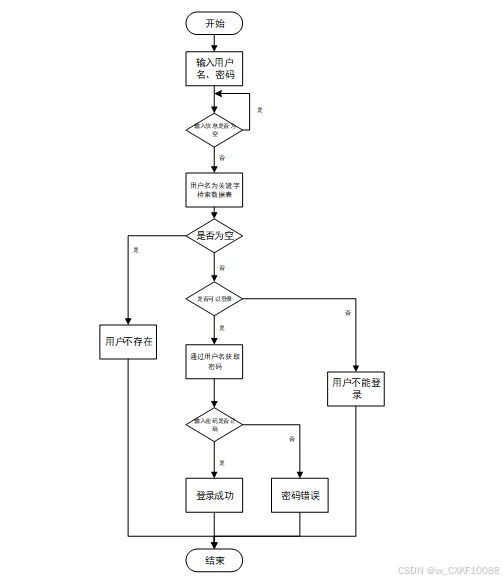 用户输入用户名和密码后,系统先检查输入是否为空,再验证用户名是否存在,若存在则通过用户名获取密码并校验。若密码正确则登录成功,否则提示密码错误。若用户名不存在或无法登录,提示用户操作无效。如图4-2所示。