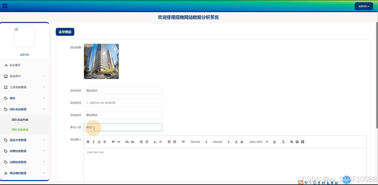 团队活动管理:管理员可以管理平台上的所有团队活动信息,包括查看活动详情、活动评论以及活动的相关数据。管理员可以进行添加新的活动、搜索活动、查询活动信息、重置活动信息和删除不需要的活动。管理员还可以查看活动的评论和回复内容,确保活动信息的准确性和及时更新。