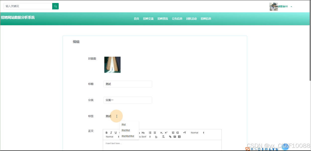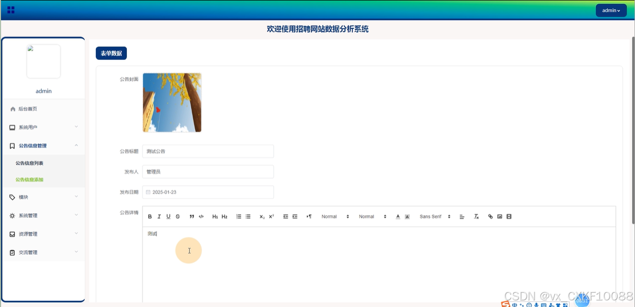资源管理:管理员可以管理招聘资讯,包括查看和修改详情,管理资讯的分类和评论,支持增删改查操作。