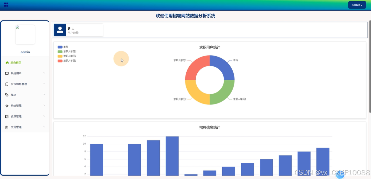 后台首页:管理员进入后台首页后,可以查看求职用户统计、招聘信息统计、应聘信息统计等数据,方便对系统的运行状况进行监控。管理员还可以修改个人资料和登录信息。
