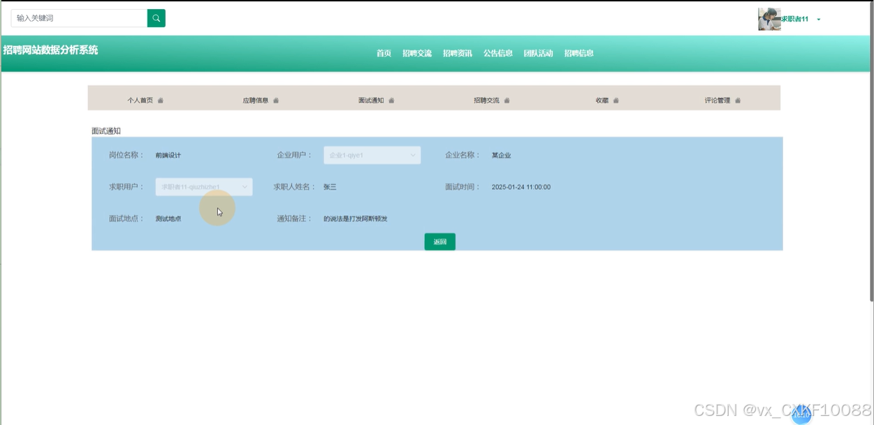 面试通知:用户能够查看面试通知的详情,包括面试时间、地点和其他相关信息。该功能支持搜索、查询、重置和删除操作。