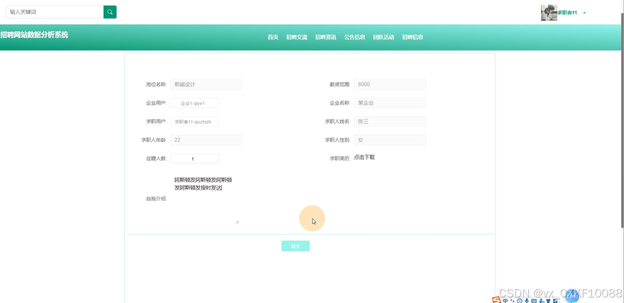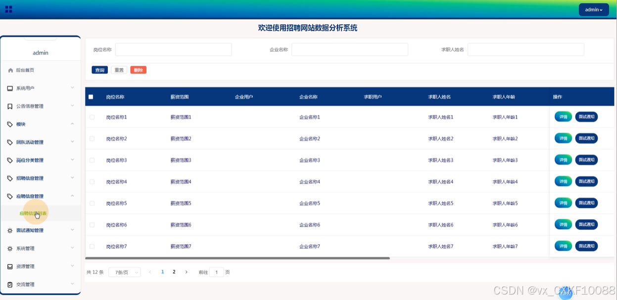 应聘信息:企业用户可以查看应聘信息,下载求职者的简历,并发送面试通知。用户可以搜索、查询、重置和删除应聘信息。