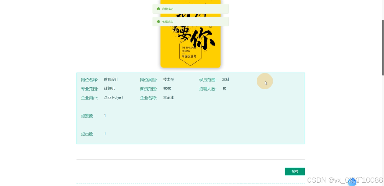 招聘信息:求职用户可以查看各类招聘信息,具体内容包括岗位名称、薪资范围、招聘人数、岗位类型和学历要求等。招聘信息支持搜索、点赞、收藏和评论等功能,用户还可以直接应聘,并通过系统上传求职简历。