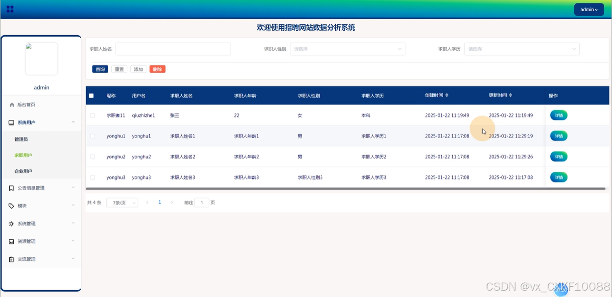 系统用户:管理员可以对系统中的用户进行管理,包括求职用户、企业用户和其他管理员。可以增删改查用户账号,确保系统的安全和管理的高效性。