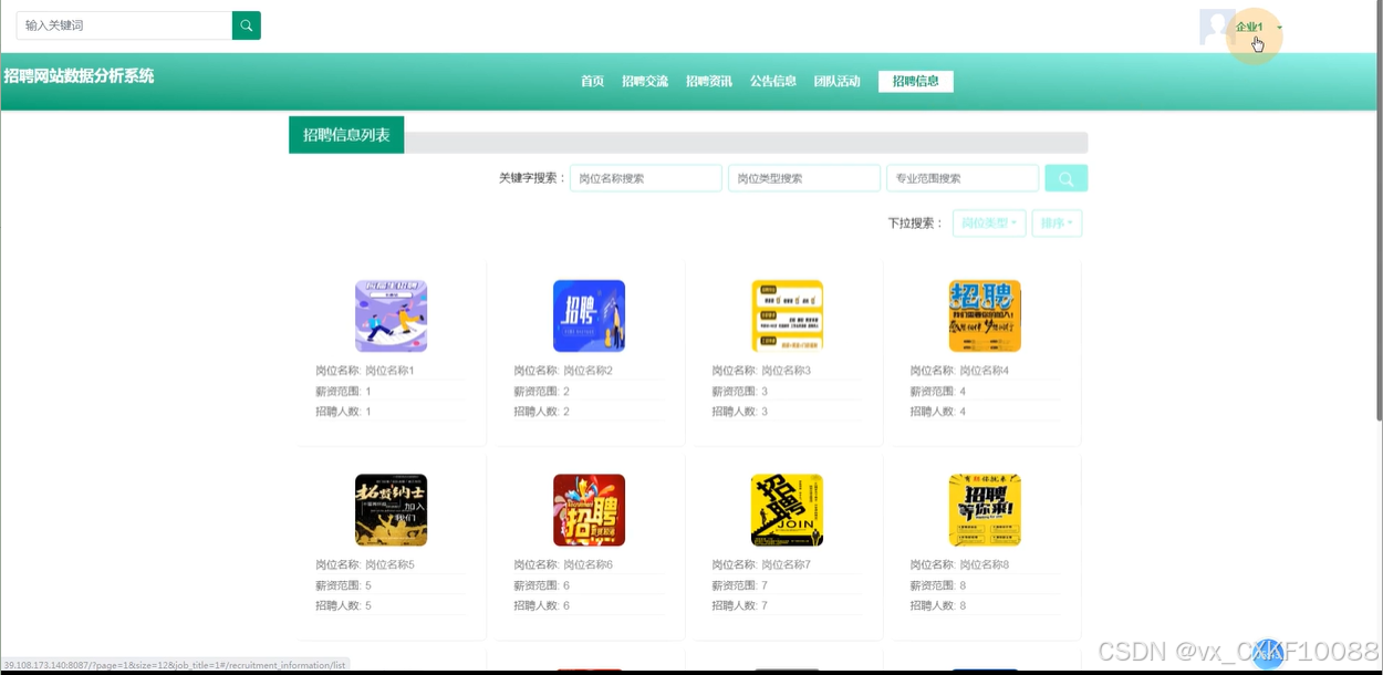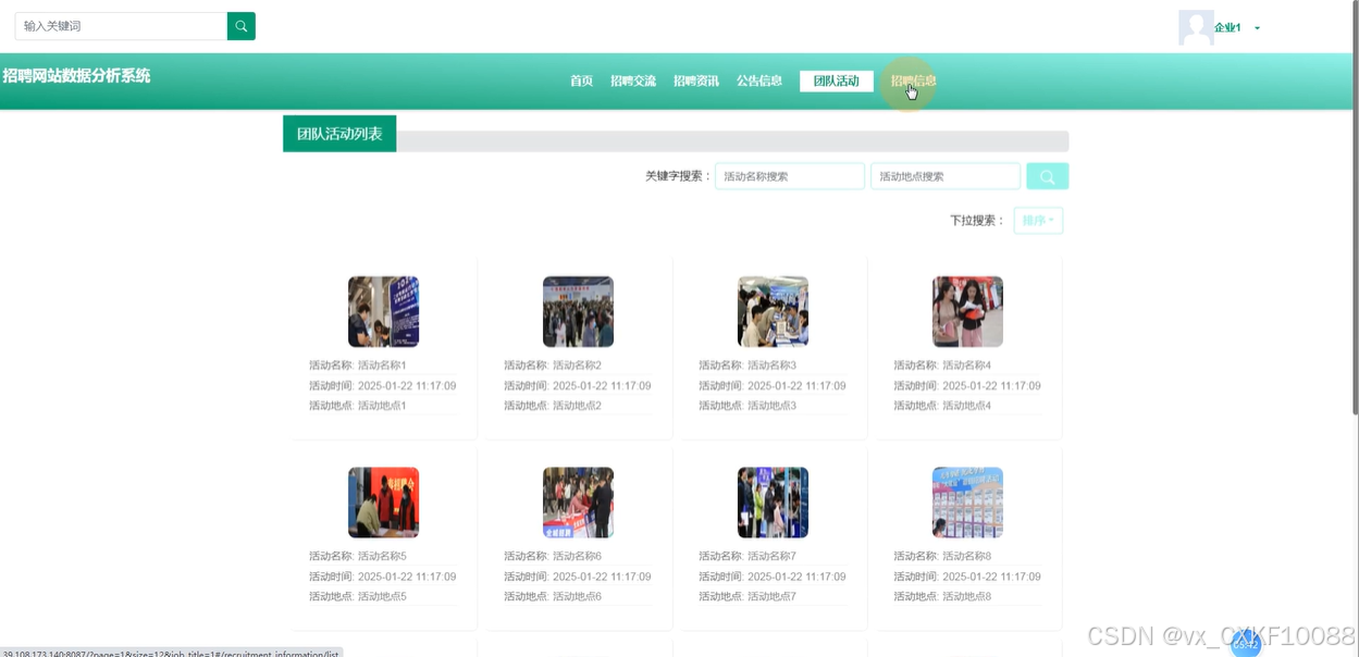 首页:企业用户登录后进入首页,首页展示轮播图、导航栏、招聘交流、招聘资讯和团队活动等推荐内容。首页还支持搜索功能,方便用户查找招聘信息、活动或资讯。