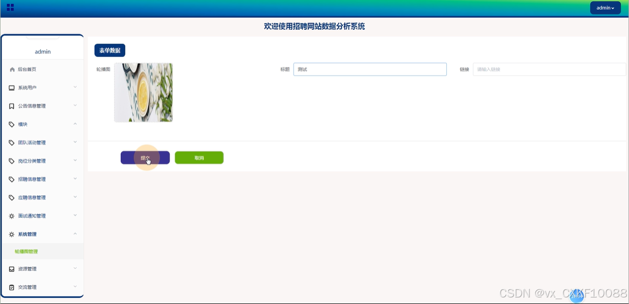 管理员负责轮播图的管理,包括查看详情、搜索和增删改查等操作,确保平台首页内容的更新与优化。如下图所示。
