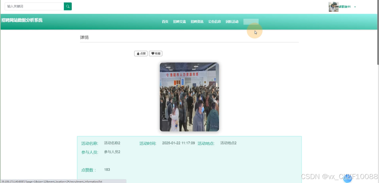 团队活动:求职用户可以查看团队活动的相关信息,包括活动名称、活动时间、活动地点和参与人员等内容。活动信息也支持搜索、点赞、收藏、评论及删除等功能。