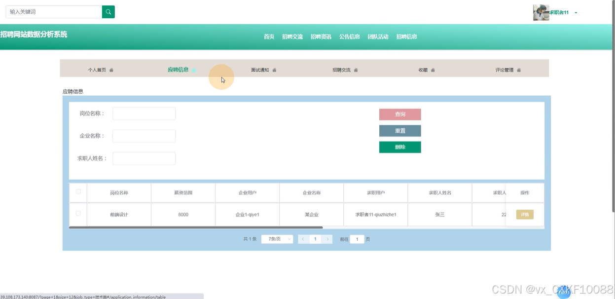 应聘信息:求职用户可以查看应聘信息,包括申请过的职位、招聘状态、面试通知等。该模块支持搜索、查询、重置和删除功能,方便管理和跟踪应聘进展。