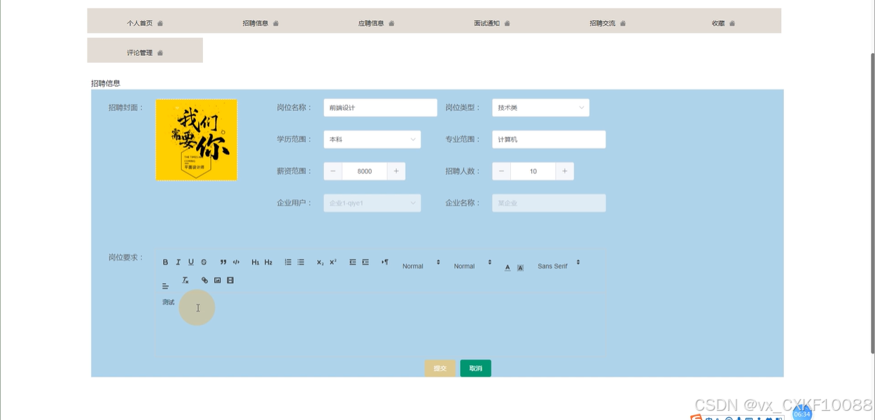注册登录:企业用户通过系统进行注册并登录,注册时需要填写企业信息,登录后可使用各项招聘相关功能。