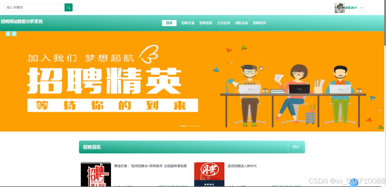 首页:求职用户登录后进入首页,首页展示轮播图、导航栏等元素,方便用户快速找到招聘交流、招聘资讯、团队活动等模块。同时,首页还提供了搜索功能,帮助用户快速查找感兴趣的内容。