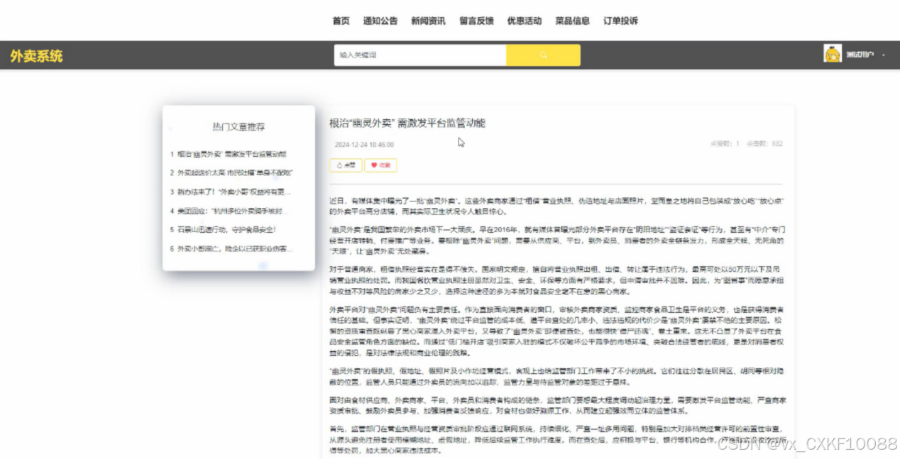 In today's increasingly popular digital lifestyle, food delivery services have become an important part of people's daily diet due to their convenience. In order to build an efficient, stable, and user-friendly food delivery service platform, we have designed and implemented a comprehensive food delivery system using the Spring Boot framework. This system not only covers the basic module of user management (including administrators, regular users, merchant users, and rider users), but also deeply integrates core business processes such as food delivery ordering, delivery, evaluation, and complaints. At the same time, we have utilized advanced database technology and backend logic to achieve multi-dimensional operational support such as route type management, dish type management, discount activity management, and dish information management. In addition, the system also integrates front-end display technology, such as carousel management, as well as back-end management technology, such as message management, notification and announcement management, resource management (news and information, information classification), etc., to comprehensively improve user experience and operational efficiency. Through the flexibility and scalability of the Spring Boot framework, we are committed to creating a secure, reliable, and easy to maintain food delivery service platform, allowing every user to enjoy a smooth and convenient service experience.