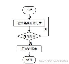 用户选择需要删除的记录后,系统判断是否确认删除。若未确认,返回选择环节;若确认删除,则更新数据库,删除对应记录,完成操作后流程结束。删除信息流程图如图4-5所示。